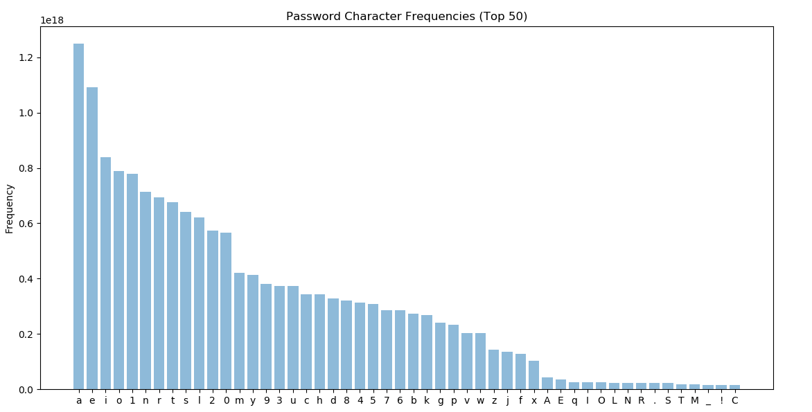 To answer the character frequency question, I generated a bar chart of the top 50 characters from the password lists.